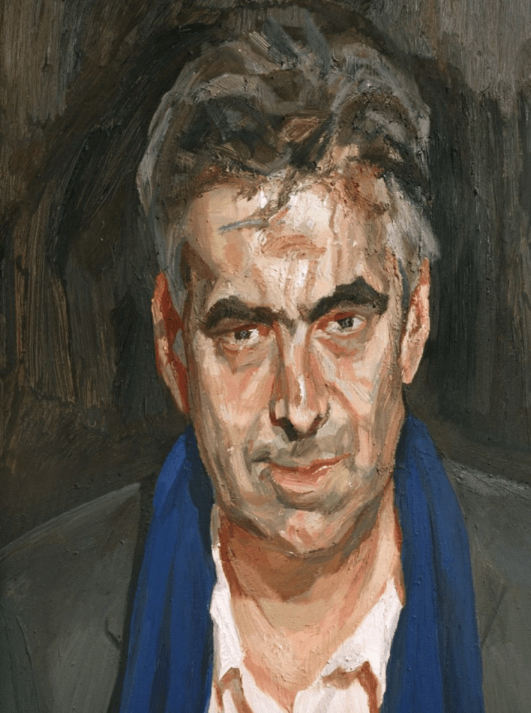 The initial lack of overall form in Freud’s paintings highlights his exceptional observational skills, allowing him to meticulously focus on the angles of a person’s face and work accurately from point to point. Freud allowed each picture to be “conceived” from no plan or idea of where it might go, allowing it to take form as it was painted. This non-traditional and more complicated approach gives the impression that the painting is a living entity – an effect Freud deliberately sought. This perhaps one that enhanced Freud’s process and enabled him able to produce a successful final image. Freud’s comment that portraits can “reflect” life is important here. Gayford writes that Man in a Blue Scarf (2004) is a painting of himself, watching Freud, watch him. The process of seeing, thinking and experiencing is central to Freud’s work, the presence of sitter and artist together in the room being one aspect of this. Gayford writes that his portrait felt like “an entity that follows its own inner laws”. This is perhaps an effect bred from Freud’s process, the freedom it gives him and the way it alters the painting.[44] The term “entity” suggests it has a life of its own, gained perhaps from the interactions between Freud and Gayford during its creation, the work and focus Freud put into its creation, the method in which Freud painted it with, and it as an object representing all the different facets that come into play in Freud’s portraits. Freud states that “the picture in order to move us must never merely remind us of life, but must acquire a life of its own,” an effect imbued into his work as a result of these that in turn enable the viewer to perceive the painting as its own “entity”.[45]