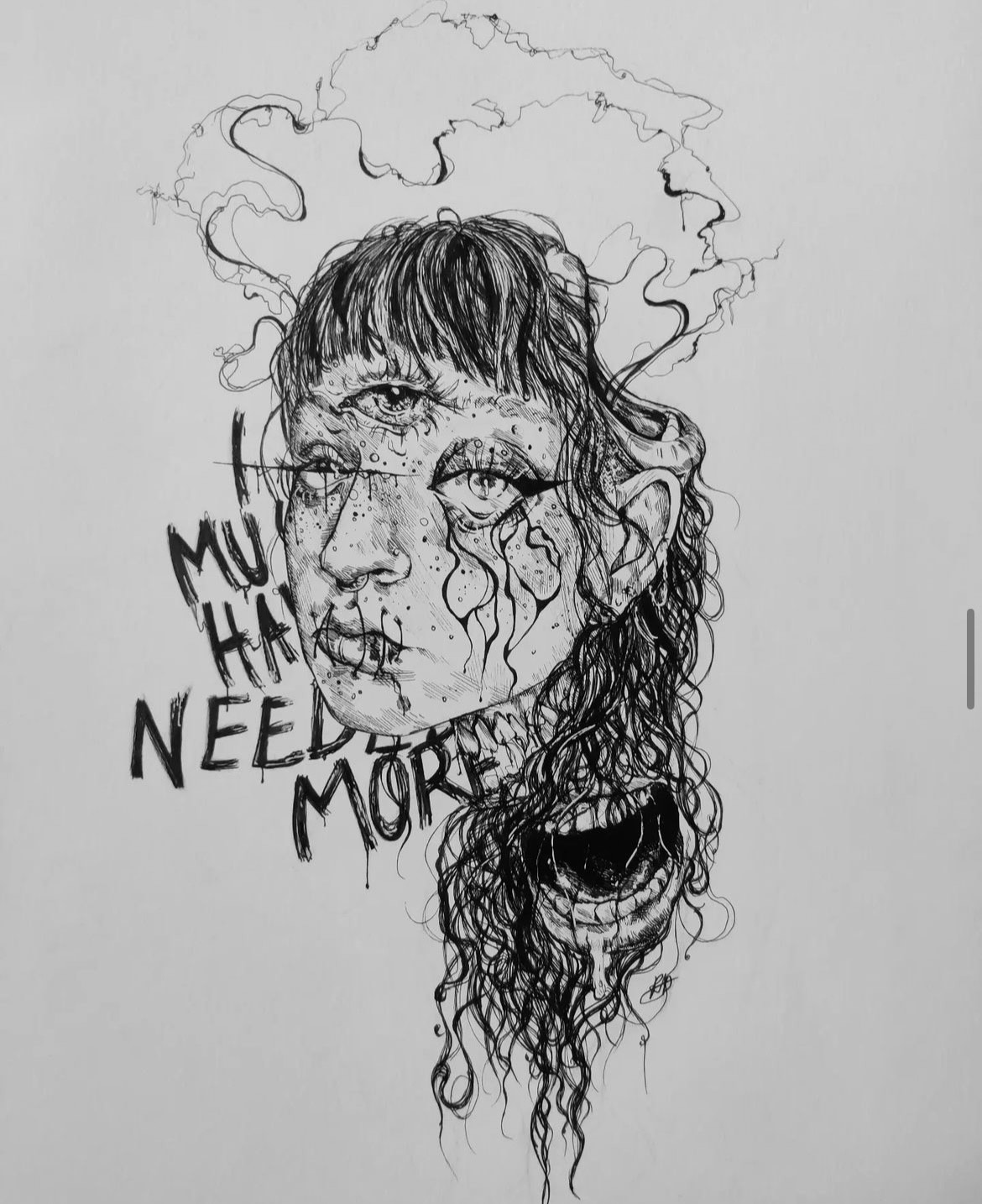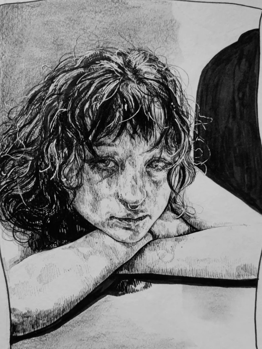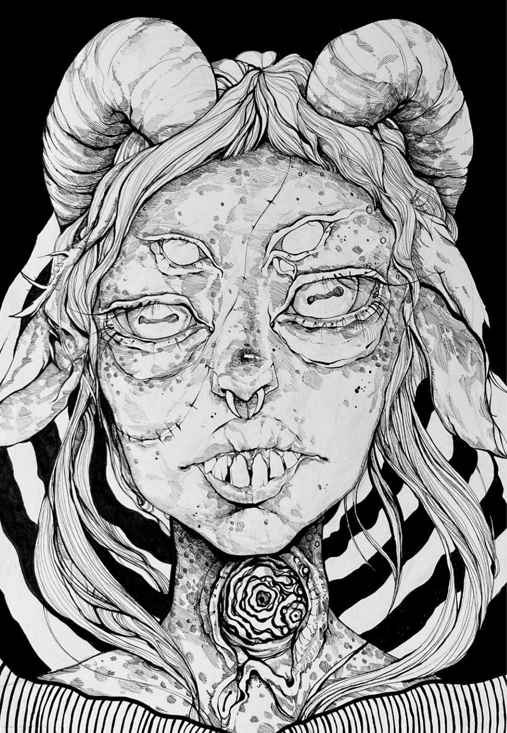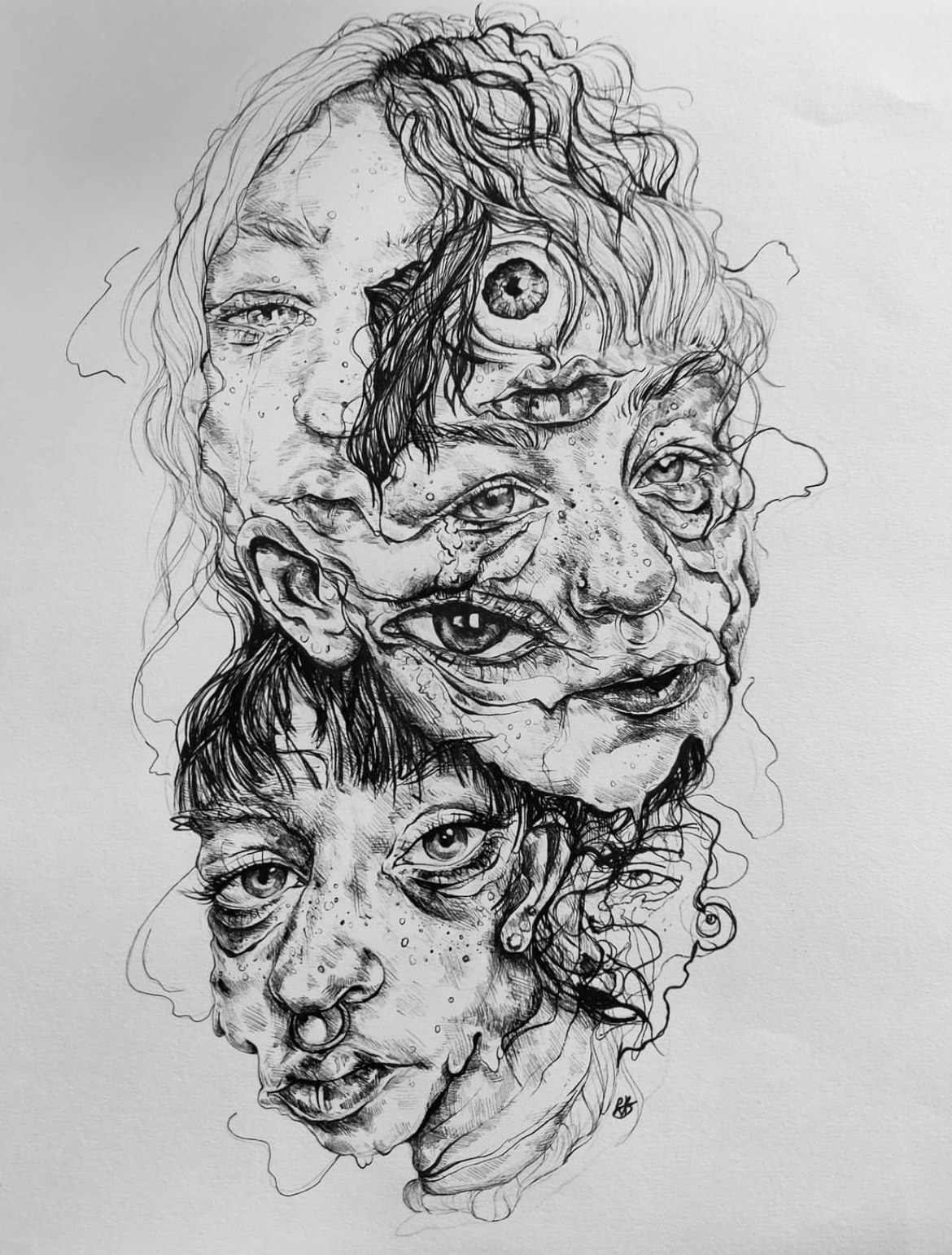 This page features my pen and ink drawings, mostly portrait work. The pieces explore fantasy themes and psychological expression, often with darker tones and imagined characters.