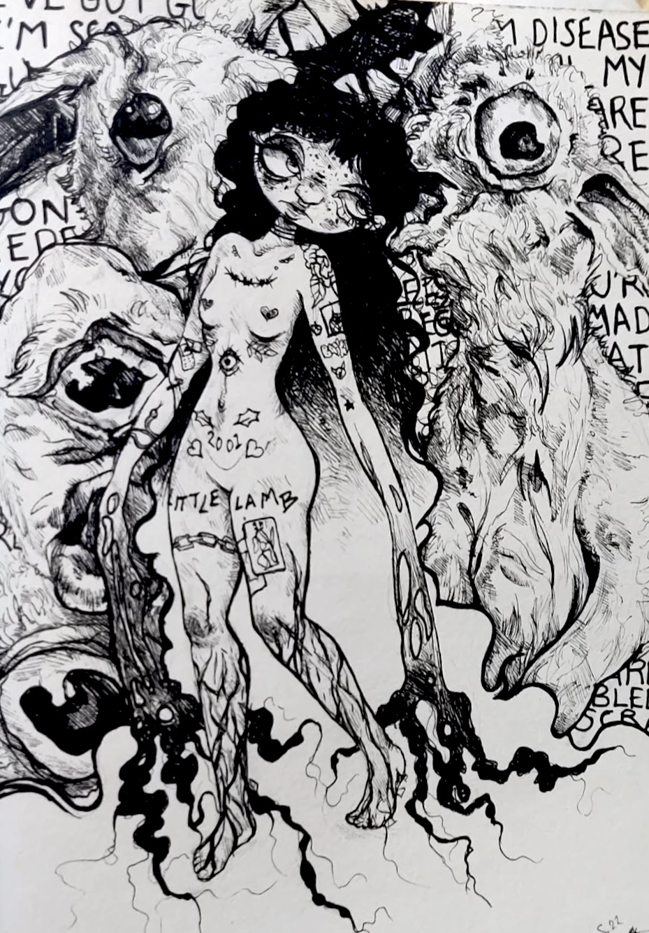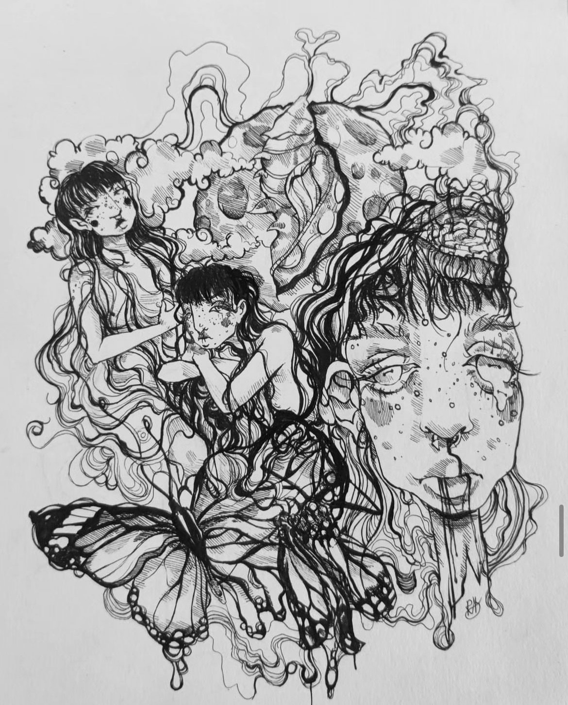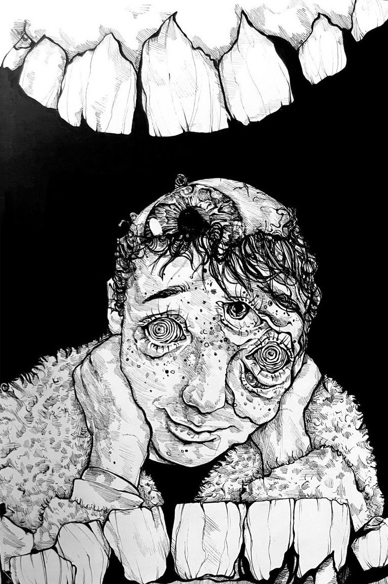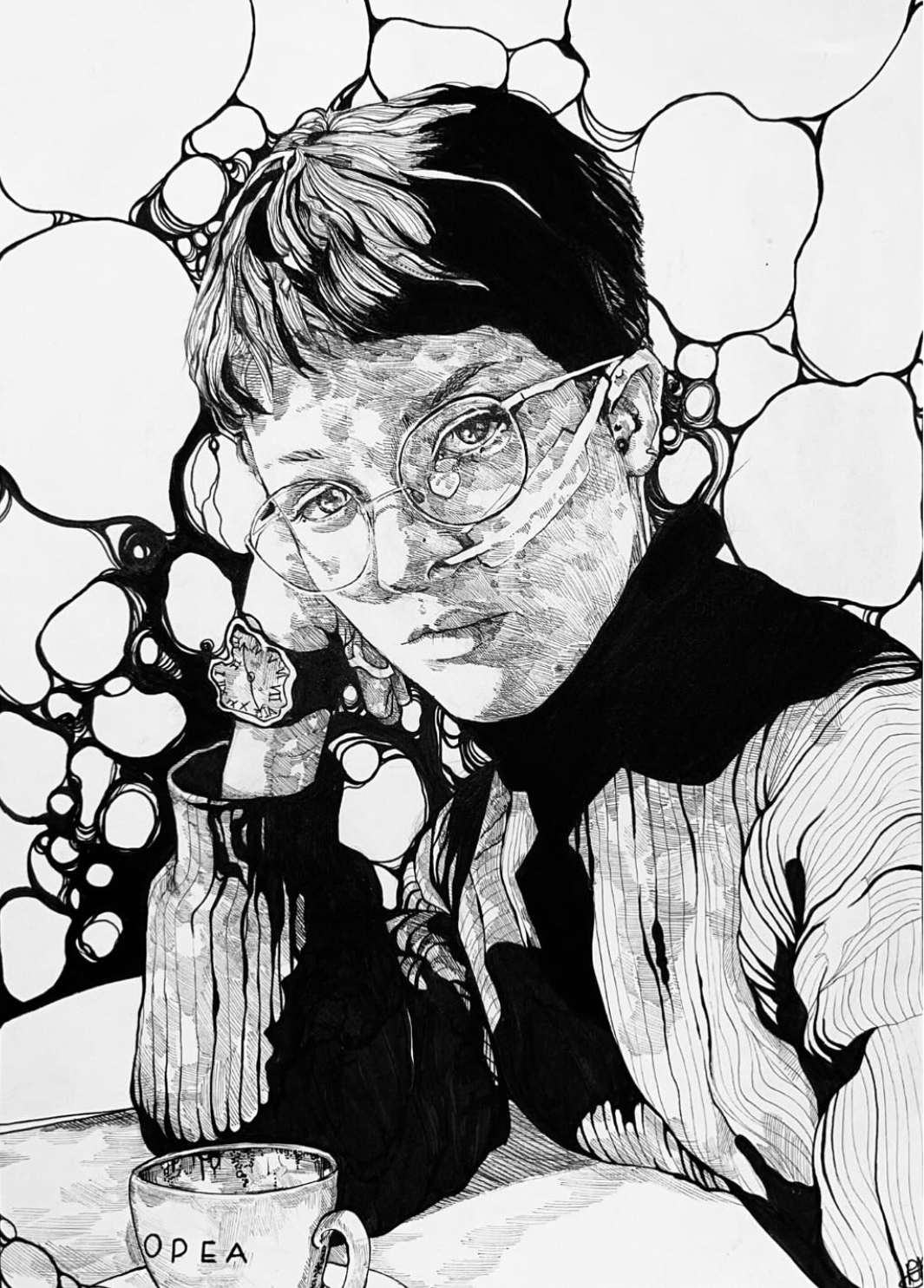 This page features my pen and ink drawings, mostly portrait work. The pieces explore fantasy themes and psychological expression, often with darker tones and imagined characters.